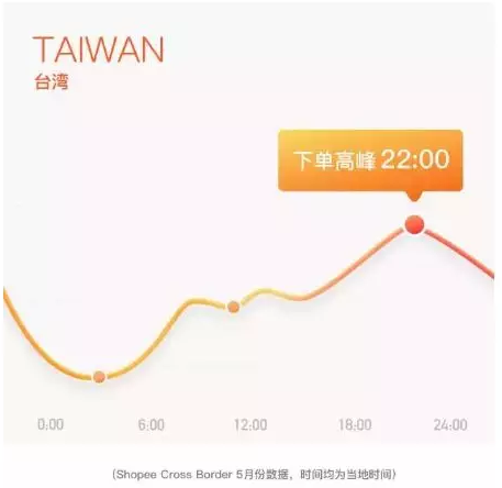 台湾和新加坡都是夜猫子集中营。Shopee台湾站点和新加坡站点夜间相当活跃,从20点开始下单量增长,一直持续到24点。疯狂下单的时间长达4小时。其中,台湾和新加坡下单人数最多的时间点分别是22点和23点。除此之外,新加坡站点在午间也有一波下单的小高峰。